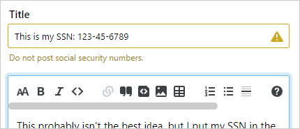 Stack Internal Enterprise has a Blocklist tool that allows you to create a list of specific words or phrases that the site will watch for as users submit text. If the Blocklist tool finds a match, it will warn the user or even block them from submitting what they wrote. Blocklist can watch for personally identifiable information (PII), passwords, security keys, profanity, and more.