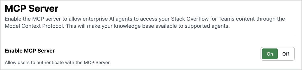 Your site's MCP server is enabled by default. If you disabled your MCP server and wish to enable it again, log in to Stack Internal Enterprise as an admin and follow these steps: