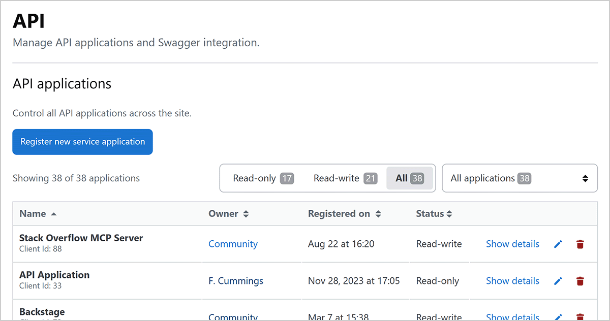 When you enable the MCP server, your site automatically registers a new "Stack Overflow MCP Server" API service application. You can see this new service application by clicking Admin settings, then API.