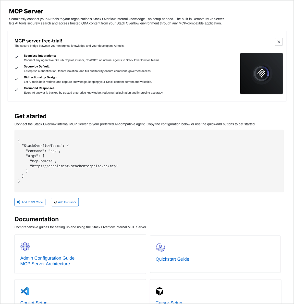 Admins and end users alike can access the MCP server landing page at https://[your_site].stackenterprise.co/mcp. There you'll find helpful information, code samples, documentation links, and more.