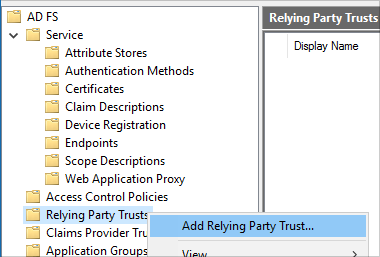 In the AD FS folder tree, right-click on Relying Party Trusts. Click Add Relying Party Trust.