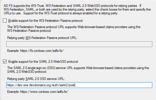 Check Enable support for the SAML 2.0 WebSSO protocol and enter the full SAML 2.0 post URL for your Stack Internal Enterprise instance (https://[your_site].stackenterprise.co/auth/saml2/post) into the Relying party SAML 2.0 SSO service URL.