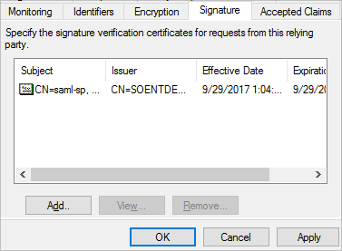 To add an optional certificate, right-click on the new Relying Party Trust. Select Properties, then the Signature tab. Click Add to add a certificate. This allows Stack Internal Enterprise to sign authentication requests and AD FS to validate the signature.
