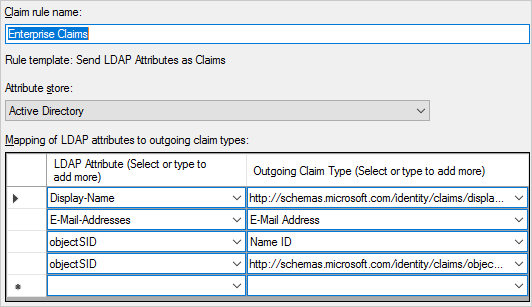 => issue(store = "Active Directory", types = ("http://schemas.xmlsoap.org/ws/2005/05/identity/claims/nameidentifier", "http://schemas.microsoft.com/identity/claims/displayname", "http://schemas.xmlsoap.org/ws/2005/05/identity/claims/emailaddress", "http://schemas.microsoft.com/identity/claims/objectidentifier"), query = ";objectSID,displayName,mail,objectSID;{0}", param = c.Value);