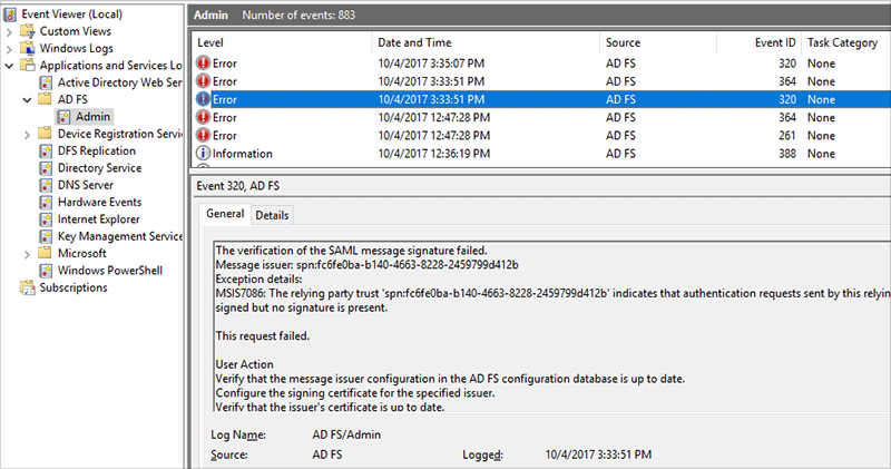 AD FS has an application-specific event log that is informative and helpful when troubleshooting problems. To access the AD FS log, open your local Event Viewer and expand the Applications and Services Logs folder. Expand the AD FS folder and click Admin.