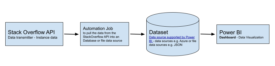 Below is an overview of how the Stack Overflow API connects to the Power BI dashboard.