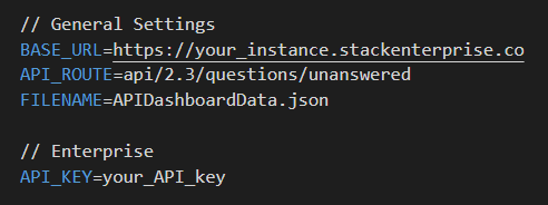 You'll set the API_Route variable to /api/2.3/questions/unanswered in this example to pull the number of unanswered questions. You could pull different data by changing the API_Route variable in the .env config file (see Install and configure the Node.js application above). Learn more about the available API routes at https://[your_site].stackenterprise.co/api/docs.