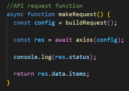 The function makeRequest() uses the axios HTTP client to make an asynchronous API call.