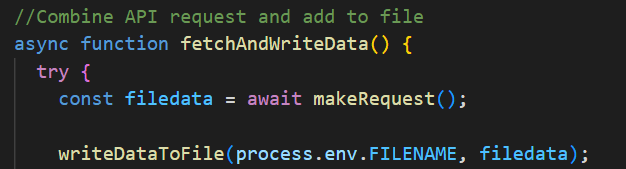 The cron job calls a function to execute the script. That function is fetchAndWriteData(), which combines the makeRequest() and writeDataToFile() functions. When first called, the fetchAndWriteData() function waits for the results of the API call in the makeRequest() function. It then uses the writeDataToFile() function to prepare (deduplicate) the data and write it to the data file.