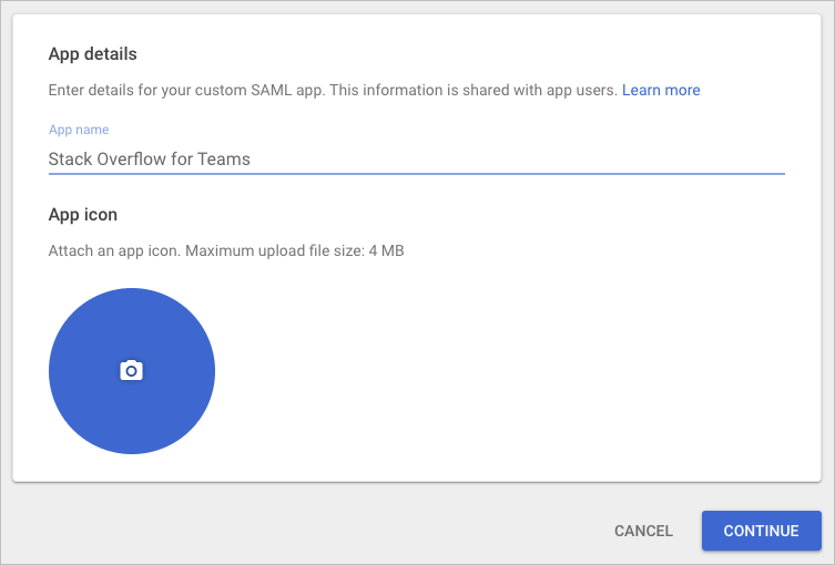 - App details Give your app any name (for example: Stack Overflow Internal). Click CONTINUE.