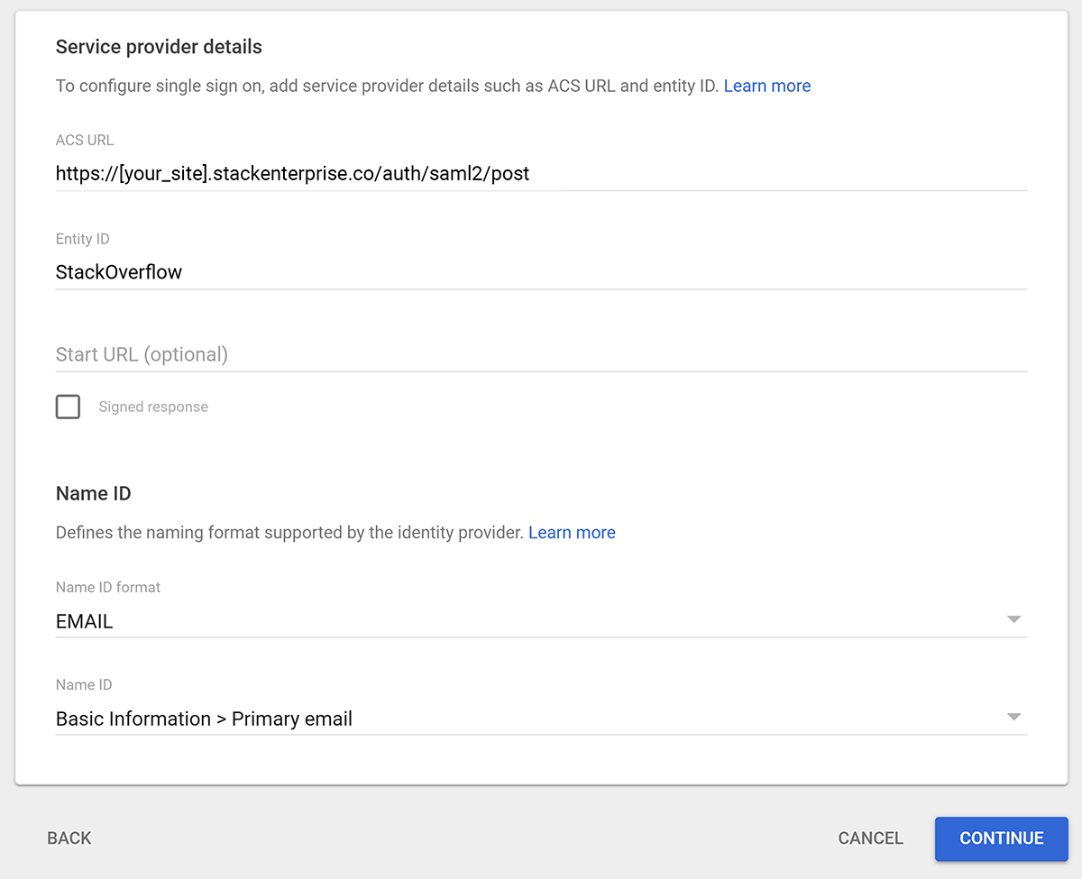- Assertion consumer service URL Set this to https://[your_site].stackenterprise.co/auth/saml2/post.