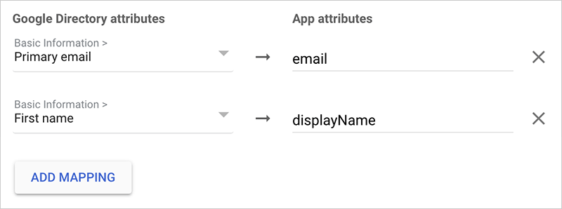 Now you'll configure the user data Google returns with the SAML response. You need to specify at least one SAML attribute for the user display name and one for the user email. Click ADD MAPPING to map Google user data to the returned SAML attributes. The SAML protocol returns the attributes you configure as assertions.