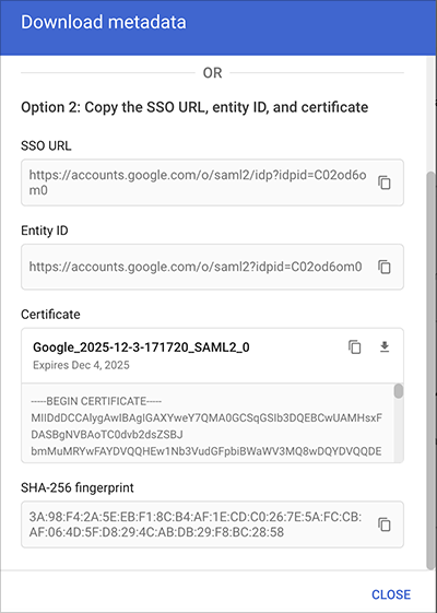 In Google, click DOWNLOAD METADATA to retrieve configuration values. You don’t need to download the file. Instead, you'll copy and paste the information into Stack Internal Enterprise.