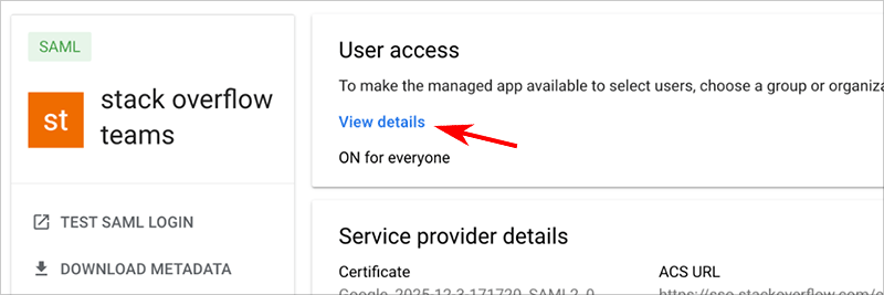 Only users (or user groups) assigned to your Google SAML app will be able to use SSO to log in to your Stack Internal Enterprise site. You can specify these users or groups in the "User access" section of your SAML app settings by clicking View details.