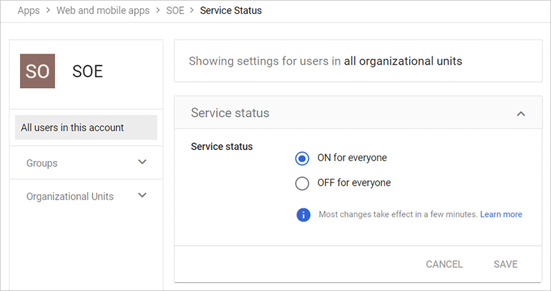 You can also make your SAML application available to everyone within your Google workspace by setting Service status to ON for everyone.
