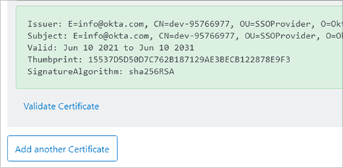 Validate your certificate by clicking Validate Certificate. You should see a green box with a success message. If you don't, make sure you copied and pasted the full text of the certificate.
