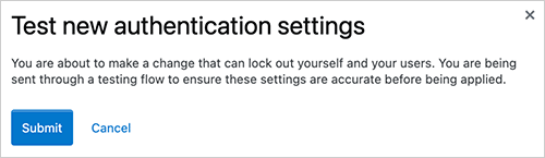 When saving settings, Stack Internal Enterprise will first perform an authentication test. If the test succeeds, Stack Internal Enterprise will apply your new authentication settings. Logged-in users stay logged in, as all active user sessions remain valid.