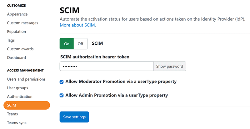 - OAuth Bearer Token Enter the SCIM authorization bearer token you created on your Stack Internal Enterprise SCIM settings page.
