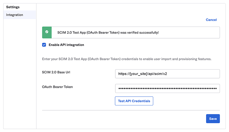 - SCIM 2.0 Base Url Set to https://[your_site].stackenterprise.co/api/scim/v2.