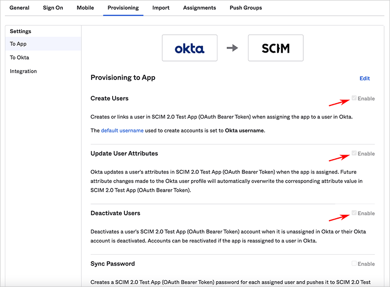 Click the "Provisioning" tab, then To App in the left-hand menu.