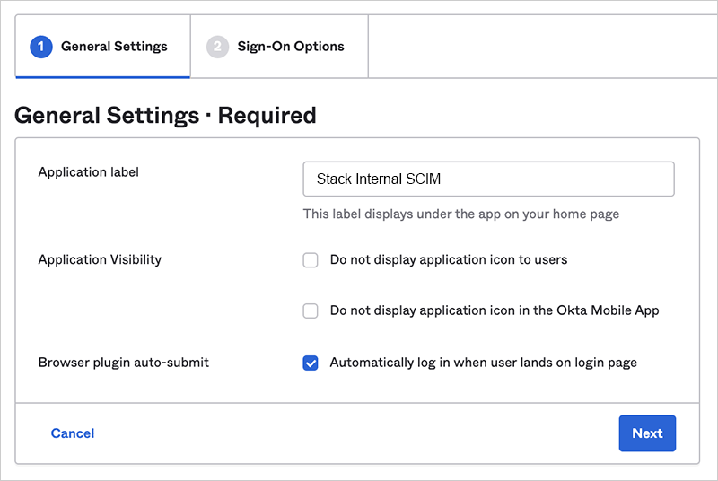 Enter a descriptive name (such as "Stack Internal SCIM") in the Application label field. You can leave other settings at their defaults, or change them depending upon your requirements.