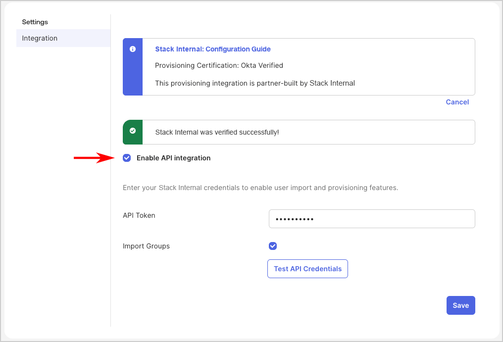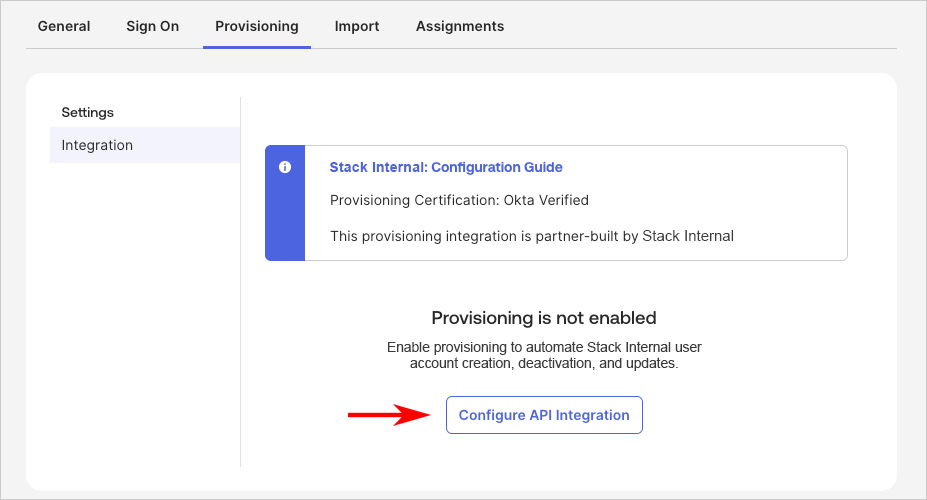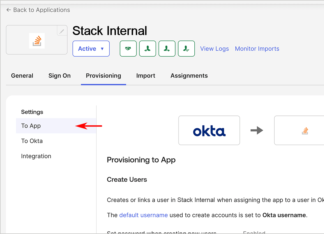 In Okta, click the "Provisioning" tab of the Stack Internal app.