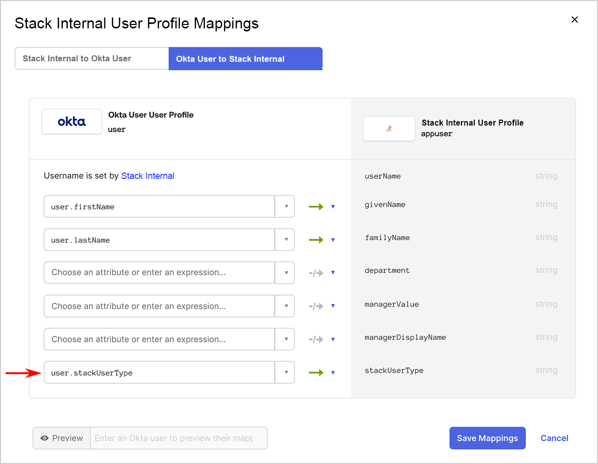 Return to the profile editor and repeat steps 3-5, this time for User (default) instead of the Stack Internal app (Okta user attribute; learn more here).