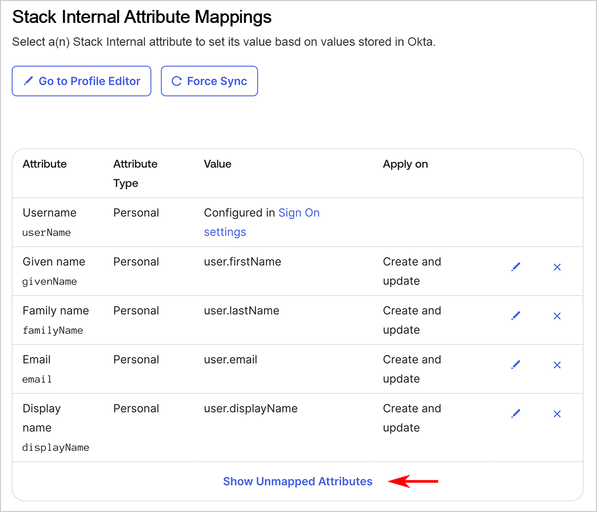 Scroll down to the "Stack Internal Attribute Mappings" section and click Show Unmapped Attributes.