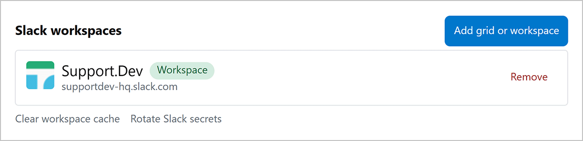 Slack workspaces allow customers with org-wide installs to integrate their Stack Internal Enterprise instance with Slack Enterprise Grid (one or multiple workspaces). This area of the admin screen lists existing workspaces. Click Add grid or workspace to create a new workspace connection. Click any workspace's Remove link to remove it.