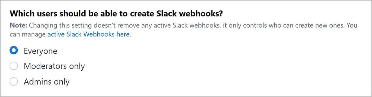 Specify which roles are allowed to create Slack webhooks (notifications) by selecting the appropriate radio button. Changing this setting doesn’t remove any active Slack webhooks—it only controls who can create new webhooks.