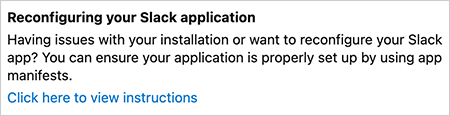 - In the "Reconfiguring your Slack application" section at the bottom of the page, click the Click here to view instructions link.