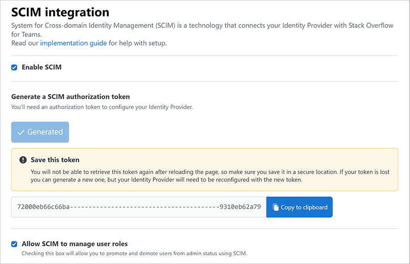 To access the SCIM integration page, click Admin Settings in the Stack Overflow Internal left-hand menu, then SCIM integration under the "ACCESS MANAGEMENT" heading. Click Enable SCIM, then click Generate token.