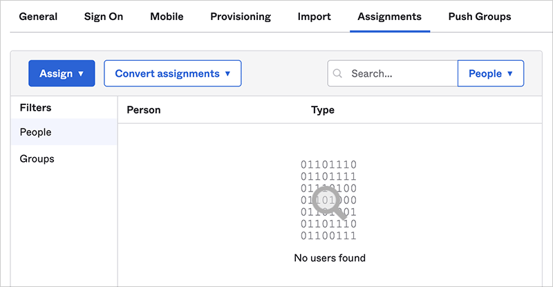 The SCIM 2.0 application should be open in Okta. Click the Assignments tab, and add users as appropriate for your organization. This may be by individual, by groups, or a combination of the two approaches. Continue on to the next section to finish the integration and enable deactivation/reactivation.