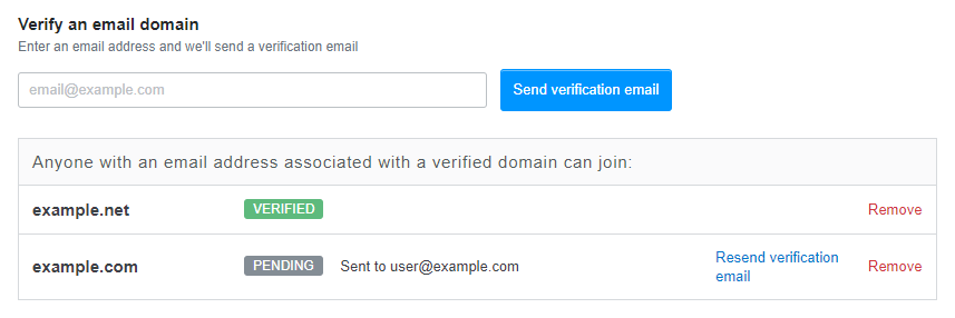 If no domain has been set yet, you can verify an email domain by entering an email address in the text field provided. This will send a confirmation link to that email address, which will add the domain of that email to your Team as a verified domain. Once at least one verified domain has been set via this method, users will be able to create accounts and join your Team by simply accessing the Team URL while logged into or creating an account tied to that email domain.