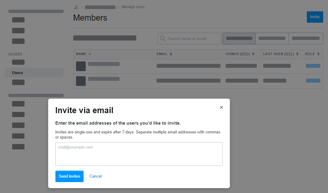 Manual invitation is a useful tool if you have users who are not on your organization's domain but still need access, or if your team is organized around a group that does not have a shared email domain. As an admin is required to send invites, you can grant access to individuals for your Team without leaving the door wide open to anyone and everyone. Invites work even if you have an email domain enabled as an authentication option, though this is not available if single sign-on is enabled.