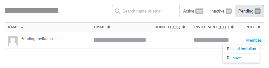You can review the status of your invites by clicking on Pending in the sort options at the top of the list. Here, you can review when invites were sent, and also perform additional actions by hovering over their Member status in the rightmost column. If the email was entered incorrectly, you can prematurely cancel the invitation. Or if the user hasn't receive the invitation email, you can resend it to the user.