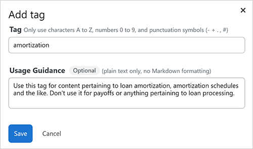 To create new tags one at a time, admins can go to the Tags page and click Add new tag. The pop-up window that appears has fields for tag name, description and usage guidance.