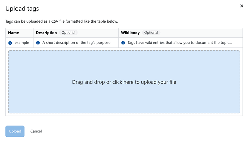 The Upload CSV button in the upper-right corner of the Tags page allows Stack Internal Business and Enterprise admins to add new tags in bulk. The tag upload tool is an efficient way to create multiple tags at the same time, which is helpful for encouraging quick user engagement in a new site or team.