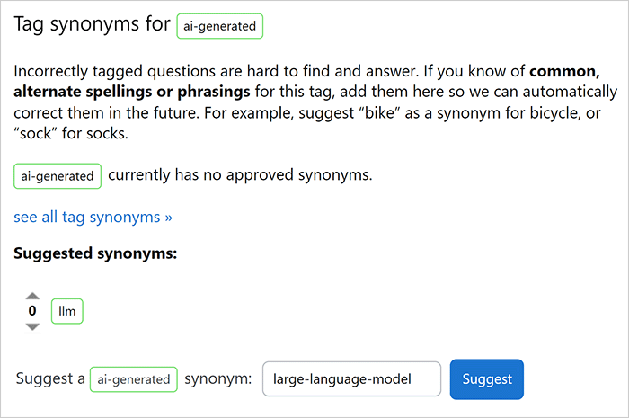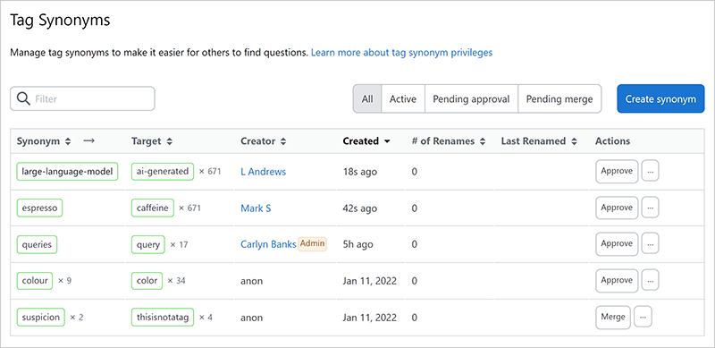 To approve your new synonym suggestion, click see all tag synonyms. The Tag synonyms page appears, showing all existing tag synonyms.