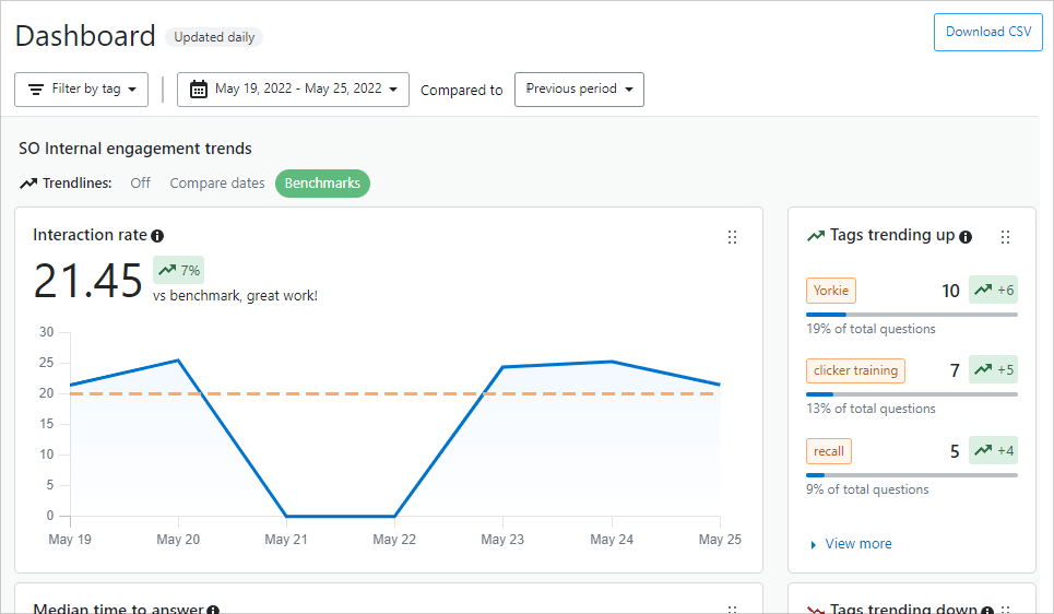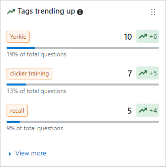 - Tags trending up: Top tags increasing in use on new questions asked or answered over the selected timeframe.