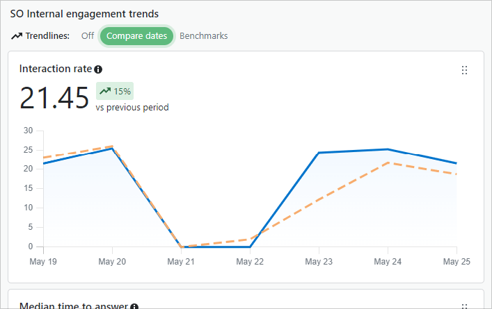 The Stack Overflow Internal Dashboard offers an easy way to learn more about the activity of your Team. It offers graphs and data into such metrics as interaction rate, answer ratio, unique visitors, trending tags and content, searches, and more. In addition, you can focus the charts with date range comparisons, benchmarks, tag filtering, and other helpful tools.