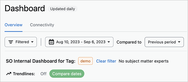 The dashboard offers several ways to filter and compare data. At the top of the dashboard are controls for filtering the statistics by tag, Community, and date range. You can also select a previous date range for comparison.