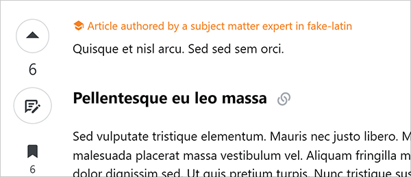 When an SME writes an article, Stack Overflow Internal adds "Article authored by a subject matter expert in [tag]" to the top of the article.