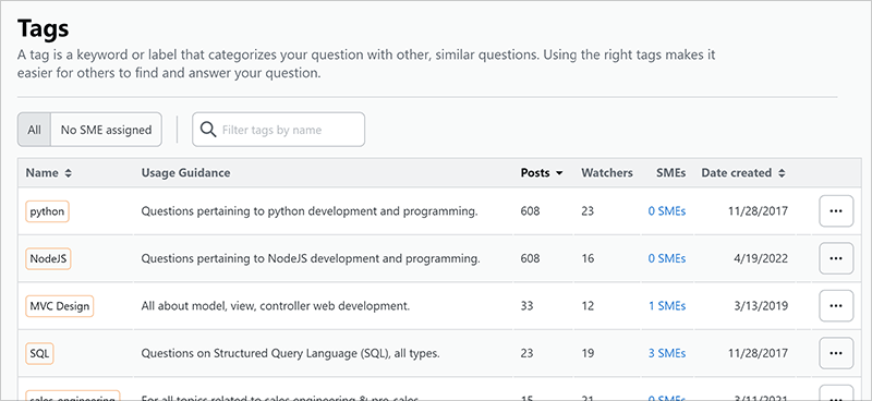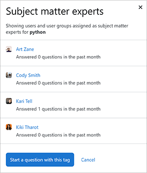 The Tags page shows how many SMEs each tag has (if any). To see the SMEs for a given tag, click its SMEs link. The tag's subject matter experts page appears, showing the SMEs and how many questions they've answered in the last month. Click any SME name to see their profile and activity pages.