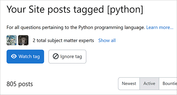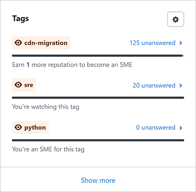 Clicking any tag takes you to the Tag page, which shows the number of SMEs for that tag along with their profile pictures. To see info on all the tag's SMEs, click Show all.