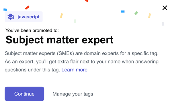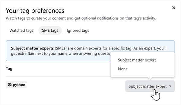 If your contributions distinguish you as having exceptional knowledge about a given topic, you may be designated as an SME. You'll know you've been granted SME status for a tag when you see an alert on your Stack Overflow Internal Home page, Questions page, or Articles page. You'll also receive a confirmation to your For You inbox and email (if enabled).