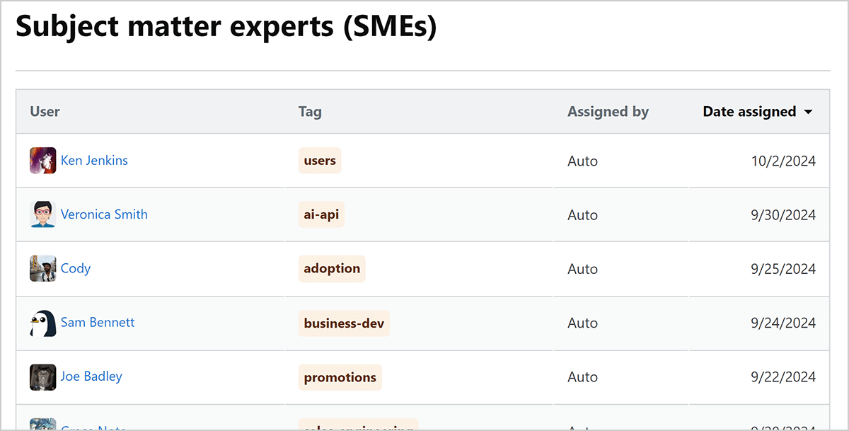 You can sort the list of SMEs by date by clicking on the Date assigned header. You can also click on any user name to go directly to their profile page.